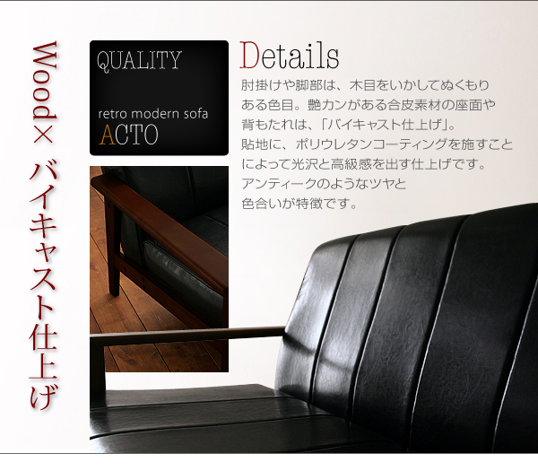 肘掛けや脚部は、木目をいかしてぬくもりある色目。艶カンがある合皮素材の座面や背もたれは、「バイキャスト仕上げ」。貼地に、ポリウレタンコーティングを施すことによって光沢と高級感を出す仕上げです。アンティークのようなツヤと色合いが特徴です。