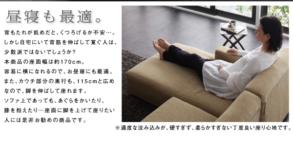 また、カウチ部分の奥行も、115cmと広めなので、脚を伸ばして座れます。