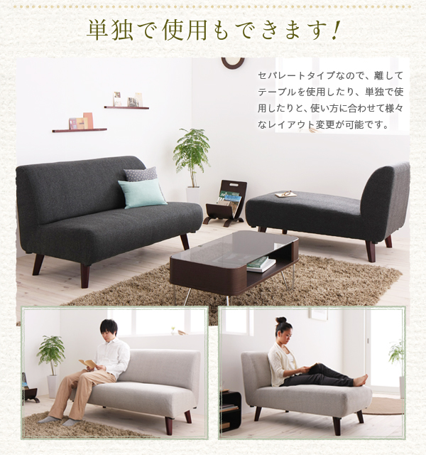 セパレートタイプなので、離してテーブルを使用したり、単独で使用したりと、使い方に合わせて様々なレイアウト変更が可能です。