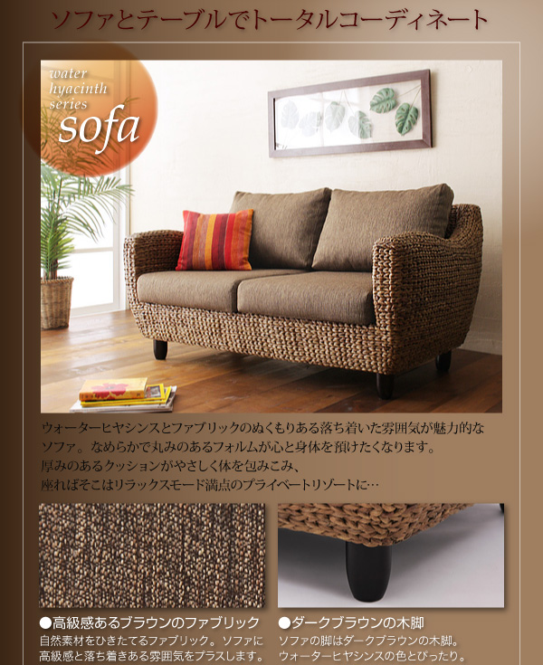 ウォーターヒヤシンスとファブリックのぬくもりある落ち着いた雰囲気が魅力的なソファ。なめらかで丸みのあるフォルムが心と身体を預けたくなります。厚みのあるクッションがやさしく体を包みこみ、座ればそこはリラックスモード満点のプライベートリゾートに・・・