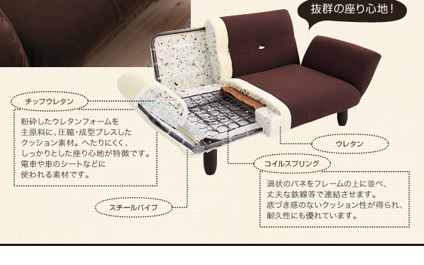 座った瞬間、もちもちとした感触と体を受け止めてくれるしっかりとした座り心地。その秘密はコイルスプリングとチップウレタンを使用しています。「耐久性」と長年使用すると感じる「へたり」にも強く、はじめの座り心地を長く感じて頂けます。