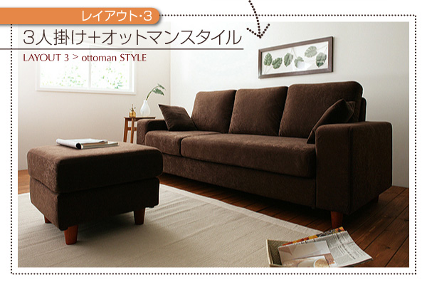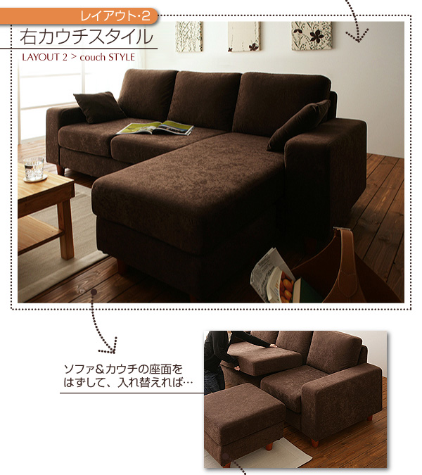 スツール&クッションの移動で自由なレイアウト!このソファの最大の特徴は、好きな時に思い通りのレイアウトでくつろげること。スツールとクッションを移動すれば、カンタンにカウチスタイルやオットマンスタイルを楽しんで頂けます。座面のクッションとスツールを動かすだけで、カンタンレイアウト♪
