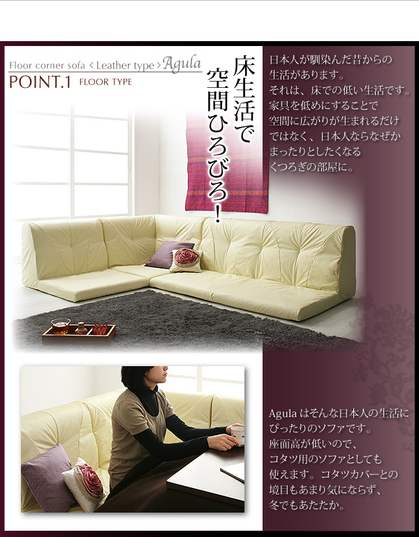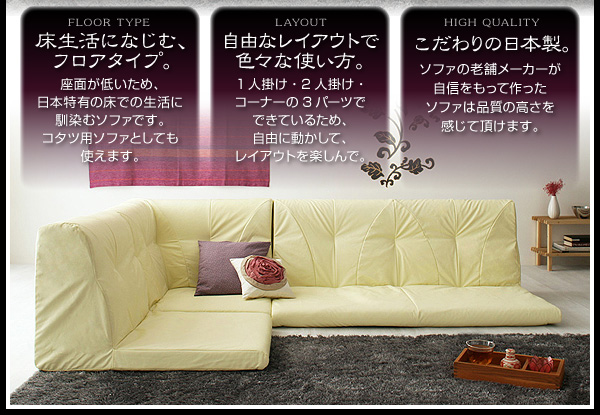 座面が低いため、日本特有の床での生活に馴染むソファです。コタツ用ソファとしても使えます。