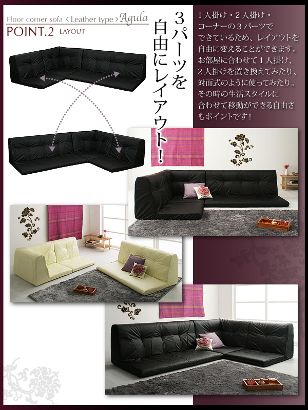 1人掛け・2人掛け・コーナーの3パーツでできているため、自由に動かして、レイアウトを楽しんで。