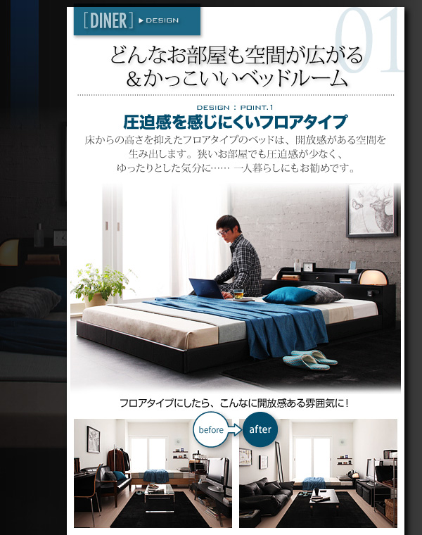 床からの高さを抑えたフロアタイプのベッドは、開放感がある空間を生み出します。狭いお部屋でも圧迫感が少なく、ゆったりとした気分に・・・一人暮らしにもお勧めです。