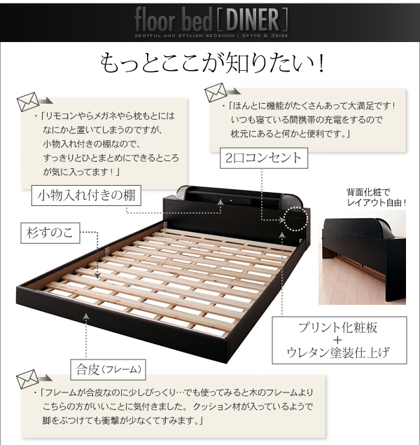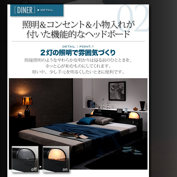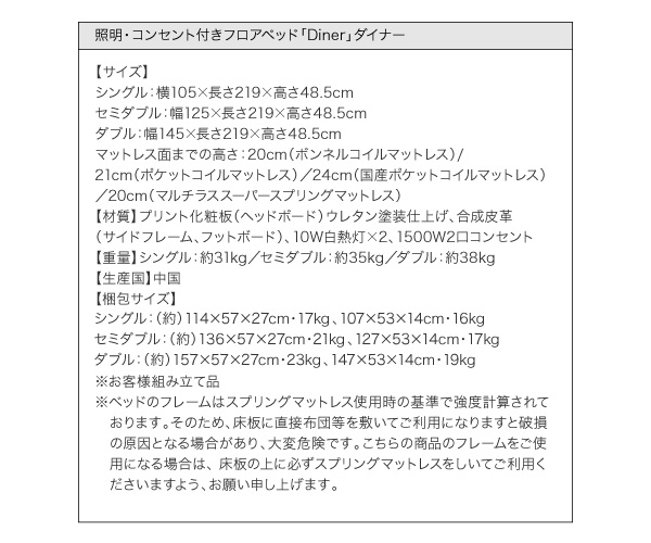 プリント化粧板(ヘッドボード)ウレタン塗装仕上げ、合成皮革(サイドフレーム、フットボード)、10W白熱灯×2、1500W2口コンセント