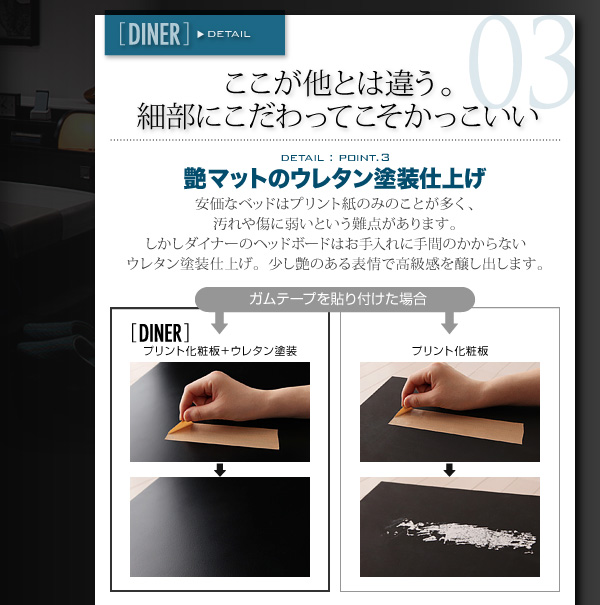 安価なベッドはプリント紙のみのことが多く、汚れや傷に弱いという難点があります。しかしダイナーのヘッドボードはお手入れに手間の掛からないウレタン塗装仕上げ。少し艶のある表情で高級感を醸し出します。