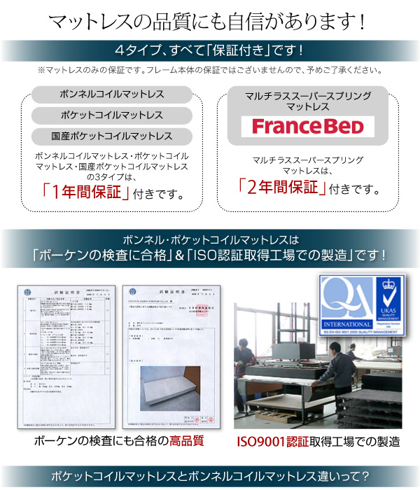 4タイプ全て「保証付き」です! (マットレスのみの保証です。フレーム本体の保証ではございませんので、予めご了承ください。)