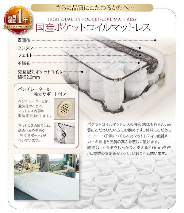 日本製ポケットコイルマットレスをご用意【1年間保証】