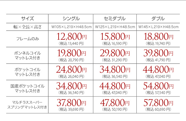 シングル:37800円(税込39690)、セミダブル:47800円(税込50190)、ダブル:57800円(税込60690)