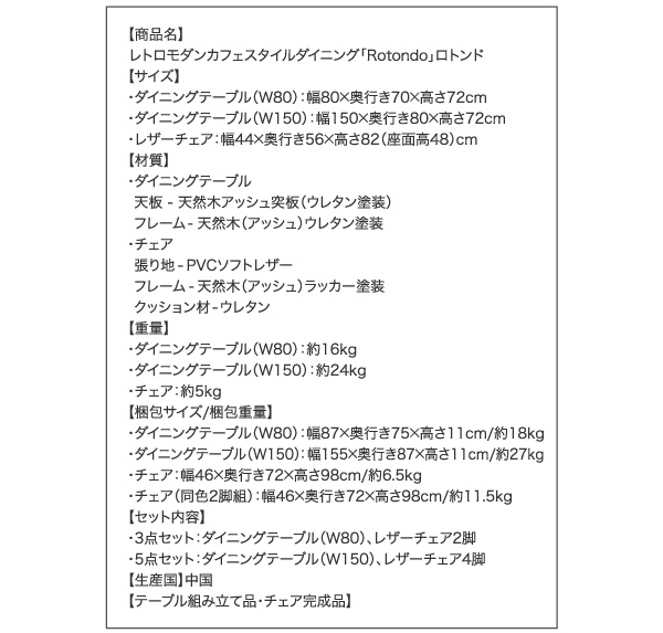 ・5点セット:ダイニングテーブル(W150)、レザーチェア4脚