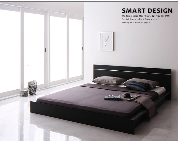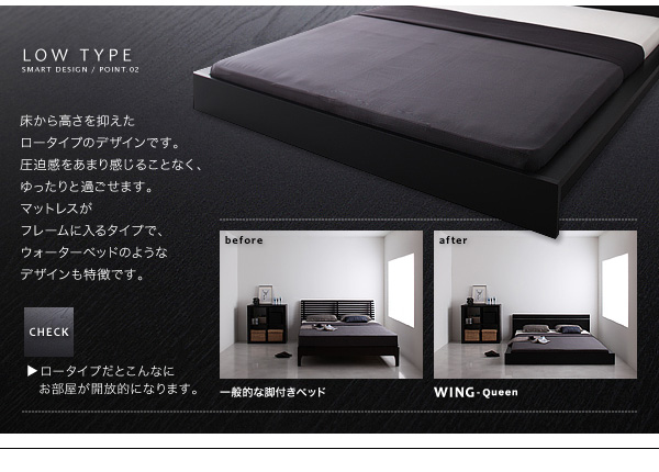 LOW TYPE:床から高さを抑えたロータイプのデザインです。圧迫感をあまり感じることなく、ゆったりと過ごせます。マットレスがフレームに入るタイプで、ウォーターベッドのようなデザインも特徴です。