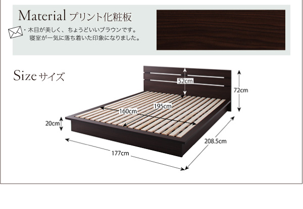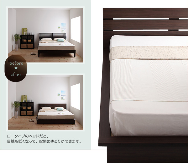 高さを抑えることで空間に広がりを生み出すロータイプのベッド。マットレスより少しフレームが出るタイプのデザインで、モダンな雰囲気のあるベッドです。ウォルナット調の木目が暖かみをプラスします。