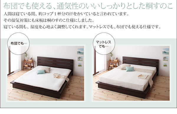 人間は寝いてる間、約コップ1杯分の汗をかいていると言われています。その湿気対策にも床板は桐のすのこ仕様に。寝ている間も、湿度を心地よく調整してくれます。マットレスでも、布団でも使える仕様です。