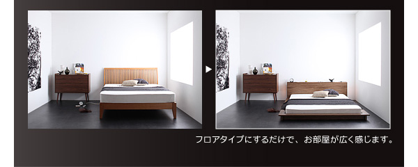 低い家具は、限りある空間に広がりを生み出します。フレームがマットレスより少し出るステージタイプのデザインで、日本人がくつろげる場所を現代のスタイリングで表現したベッドです。