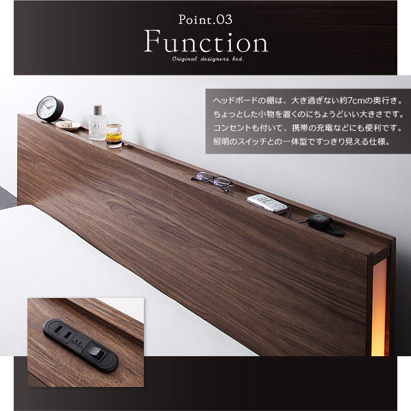 ヘッドボードの棚は、大き過ぎない約7cmの奥行き。ちょっとした小物を置くのにちょうどいい大きさです。コンセントも付いて、携帯の充電などにも便利です。照明のスイッチとの一体型ですっきり見える仕様。