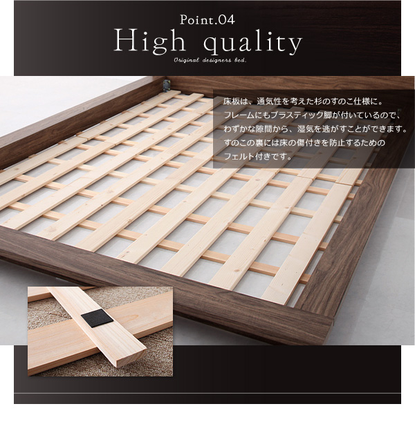 床板は、通気性を考えた杉のすのこ仕様に。人が寝ている間にかく汗の湿気を、しっかりと逃がしてあげることが大切です。すのこの裏には床の傷付きを防止するためのフェルト付きです。