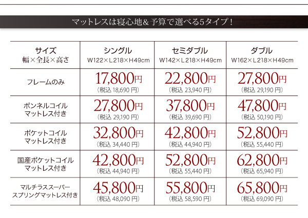 シングル:45800円(税込48090)、セミダブル:55800円(税込58590)、ダブル:65800円(税込69090)