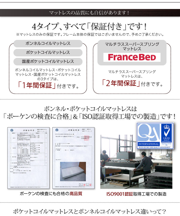 4タイプ全て「保証付き」です! (マットレスのみの保証です。フレーム本体の保証ではございませんので、予めご了承ください。)