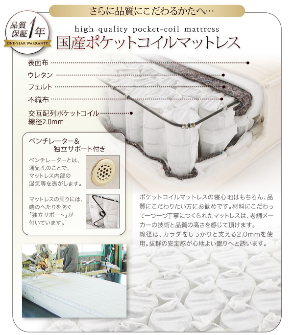 日本製ポケットコイルマットレスをご用意【1年間保証】