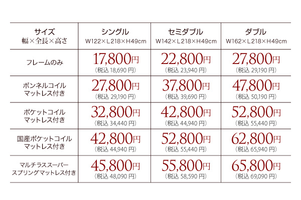 シングル:42800円(税込44940)、セミダブル:52800円(税込55440)、ダブル:62800円(税込65940)