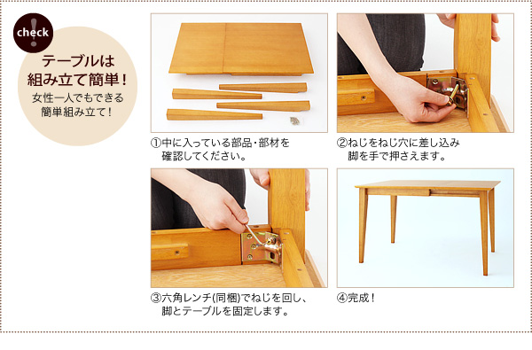 六角レンチ(同梱)でねじを回し、脚とテーブルを固定します。