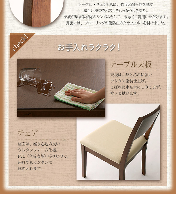 テーブル・チェアともに、強度と耐久性を試す厳しい検査をパスしたしっかりした造り。家族が集まる家庭のシンボルとして、末永くご愛用いただけます。