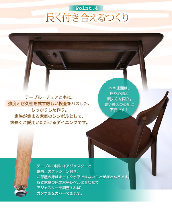 テーブル・チェアともに、強度と耐久性を試す厳しい検査をパスした、しっかりした作り。家族が集まる家庭のシンボルとして、末長くご愛用いただけるダイニングです。