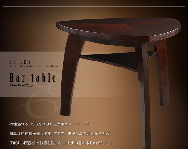 個性溢れる、丸みを帯びた三角形のバーテーブル。重厚な存在感が醸し出す、アジアンモダンな雰囲気がお洒落。丁度よい距離感でお酒を愉しむ、オトナの隠れ家Barがここに。