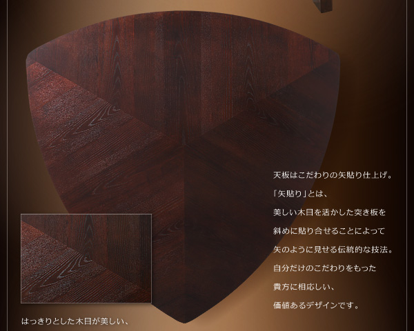 天板はこだわりの矢貼り仕上げ。「矢貼り」とは、美しい木目を活かした突き板を斜めに貼り合せることによって矢のように見せる伝統的な技法。自分だけのこだわりをもった貴方に相応しい、価値あるデザインです。
