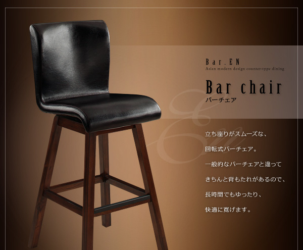 立ち座りがスムーズな、回転式バーチェア。一般的なバーチェアと違ってきちんと背もたれがあるので、長時間でもゆったり、快適に寛げます。