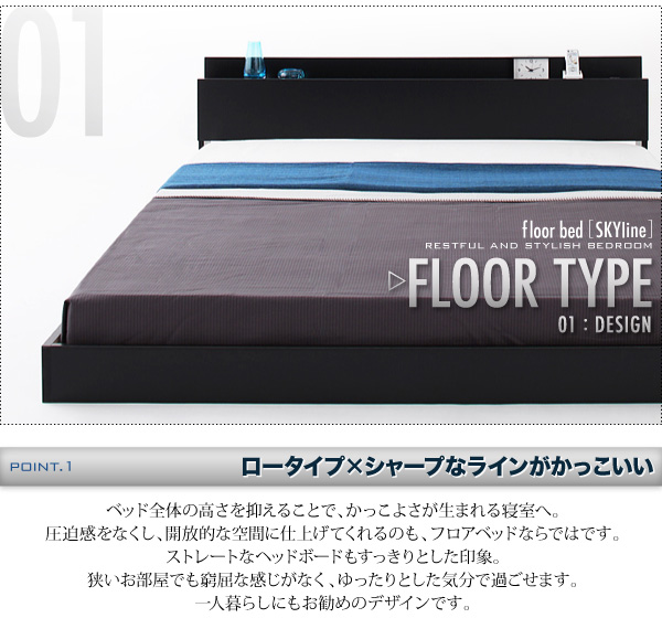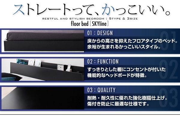 ベッド全体の高さを抑えることで、かっこよさが生まれる寝室へ。圧迫感をなくし、開放的な空間に仕上げてくれるのも、フロアベッドならではです。ストレートなヘッドボードもすっきりとした印象。狭いお部屋でも窮屈な感じがなく、ゆったりとした気分で過ごせます。一人暮らしにもお勧めのデザインです。