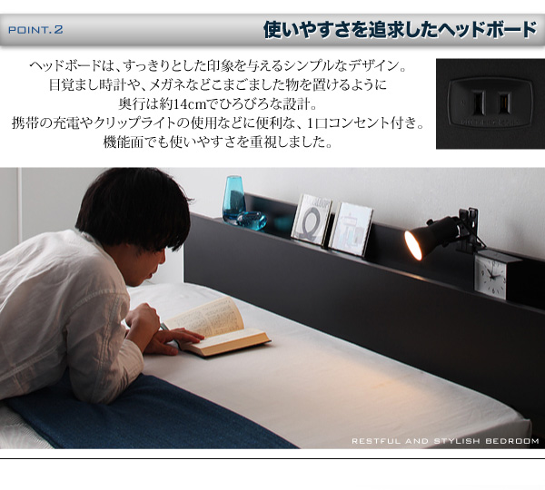ヘッドボードは、すっきりとした印象を与えるシンプルなデザイン。目覚まし時計や、メガネなどこまごました物を置けるように奥行は約14cmでひろびろな設計。携帯の充電やクリップライトの使用などに便利な、1口コンセント付き。機能面でも使いやすさを重視しました。