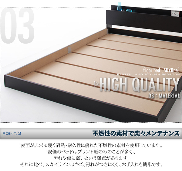 表面が非常に硬く耐熱・耐久性に優れた不燃性の素材を使用しています。安価なベッドはプリント紙のことが多く、汚れや傷に弱いという難点があります。それに比べ、スカイラインはキズ、汚れがつきにくく、お手入れも簡単です。