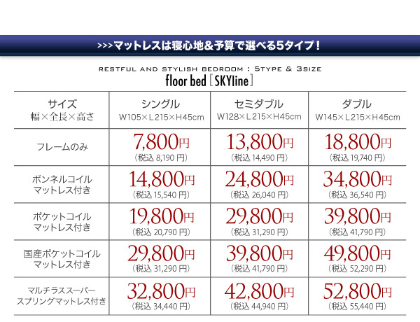 シングル:19800円(税込20790)、セミダブル:29800円(税込31290)、ダブル:39800円(税込41790)