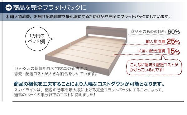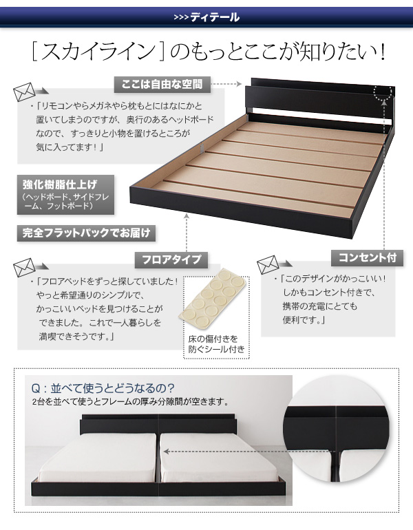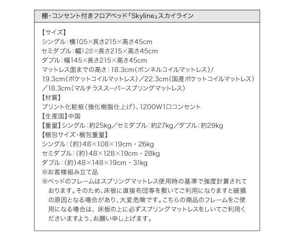 注意※ベッドのフレームはスプリングマットレス使用時の基準で強度計算されております。そのため、床板に直接布団等を敷いてご利用になりますと破損の原因となる場合があり、大変危険です。こちらの商品のフレームをご使用になる場合は、床板の上に必ずスプリングマットレスをしいてご利用くださいますよう、お願い申し上げます。