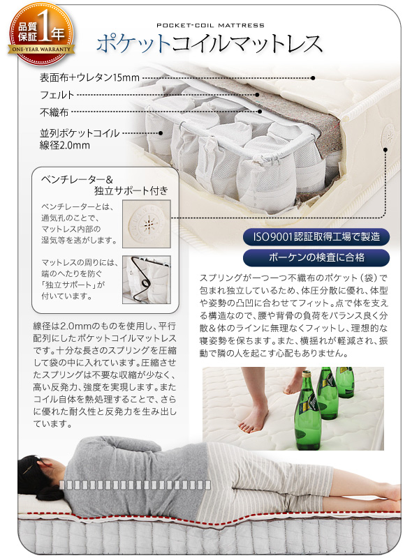 日本製ポケットコイルマットレスをご用意【1年間保証】