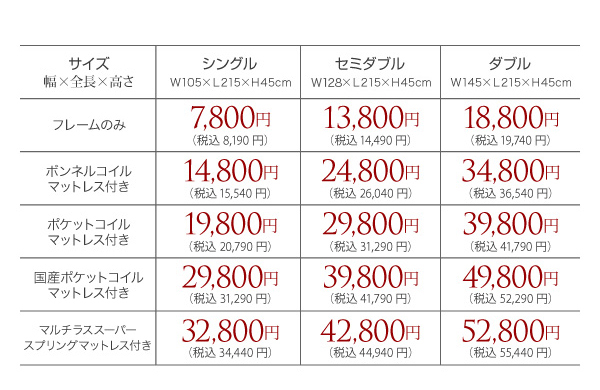 シングル:32800円(税込34440)、セミダブル:42800円(税込44940)、ダブル:52800円(税込55440)