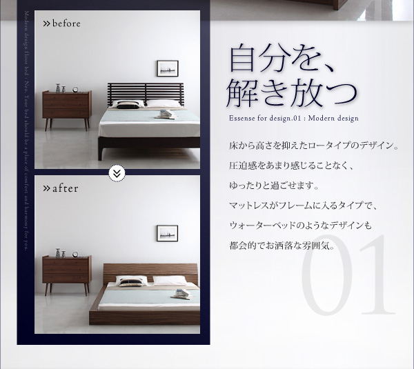 床から高さを抑えたロータイプのデザイン。圧迫感をあまり感じることなく、ゆったりと過ごせます。マットレスがフレームに入るタイプで、ウォーターベッドのようなデザインも都会的でお洒落な雰囲気。