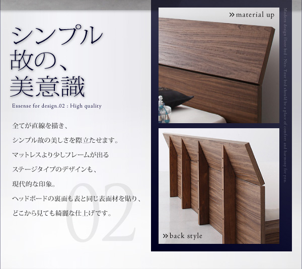 全てが直線を描き、シンプル故の美しさを際立たせます。マットレスより少しフレームが出るステージタイプのデザインも、現代的な印象。ヘッドボードの裏面も表と同じ表面材を貼り、綺麗な仕上げです。