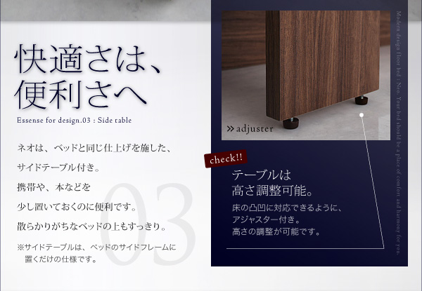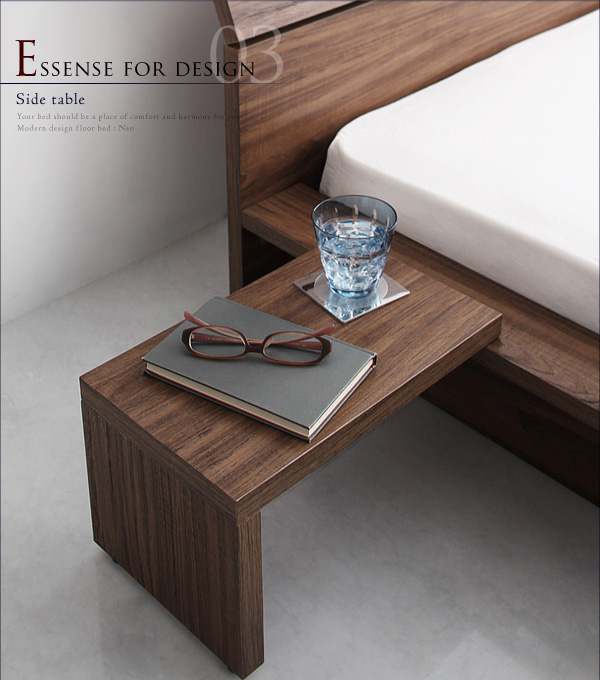 ネオは、ベッドと同じ仕上げを施した、サイドテーブル付き。携帯や、本などを少し置いておくのに便利です。散らかりがちなベッドの上もすっきり。