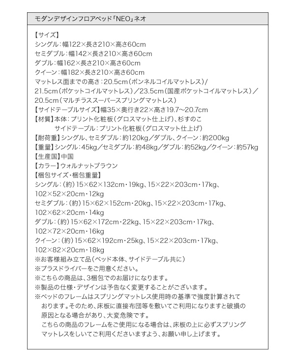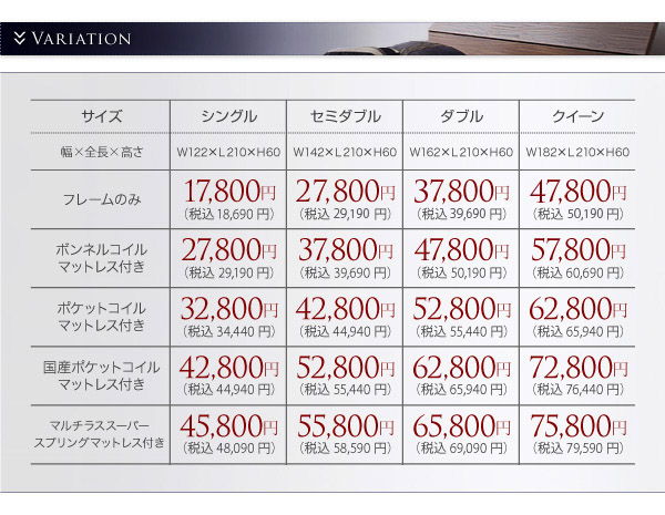 シングル:42800円(税込44940)、セミダブル:52800円(税込55440)、ダブル:62800円(税込65940)、クイーン:72800円(税込76440)