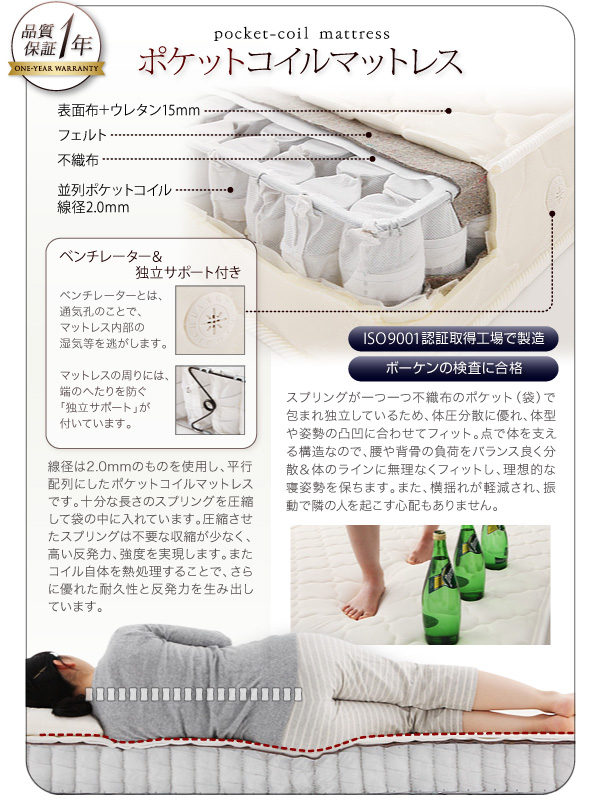 日本製ポケットコイルマットレスをご用意【1年間保証】