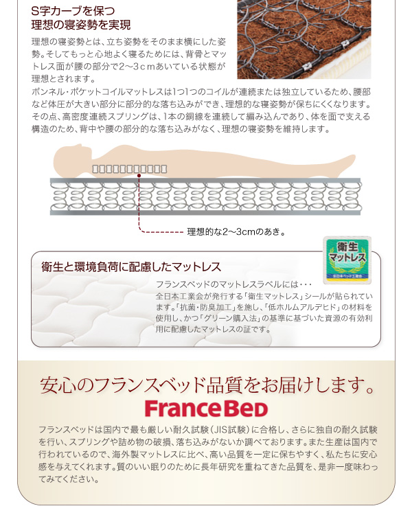 フランスベッド独自の高性能スプリングで、部分的な落ち込みがなく、理想的な寝姿勢を維持します。