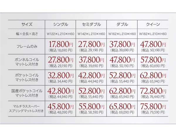 シングル:45800円(税込48090)、セミダブル:55800円(税込58590)、ダブル:65800円(税込69090)、クイーン:75800円(税込79590)