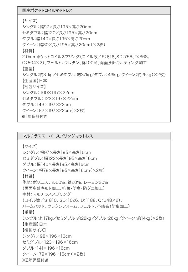 2.0mmポケットコイルスプリング(コイル数/S:616、SD:756、D:868、Q:504×2)、ウレタン、フェルト、綿100%、両面多針キルティング加工