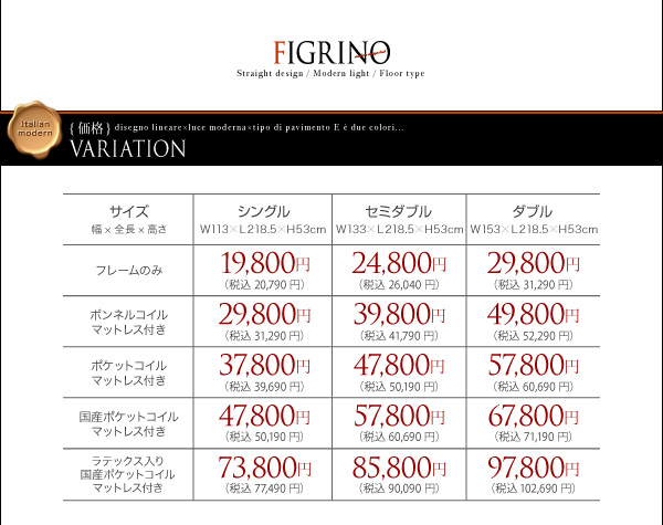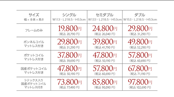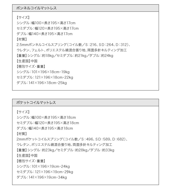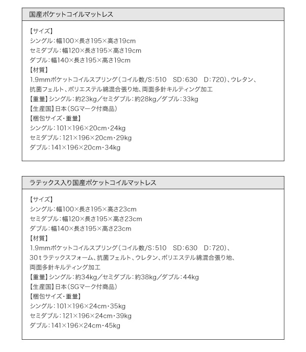 マットレス面までの高さ(約):ボンネルコイル18.5/ポケットコイル19.5/国産ポケットコイル20.5/ラテックス入り24.5cm