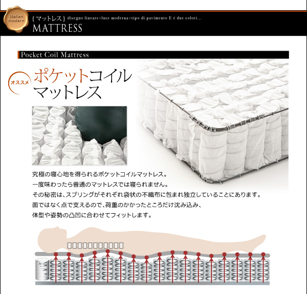 究極の寝心地を得られるポケットコイルマットレス。一度味わったら普通のマットレスはでは寝られません。その秘密は、スプリングがそれぞれ袋状の不織布に包まれ独立しているので、荷重のかかった場所だけが沈み込む構造だから。面ではなく点で支えるので、荷重のかかったところだけ沈み込み、体型や姿勢の凸凹に合わせてフィットします。