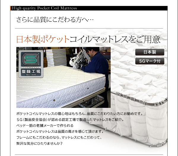 SGマーク付・日本製ポケットコイルマットレスをご用意 ポケットコイルマットレスの寝心地はもちろん、品質にこだわりたい方にお勧めです。SG(製品安全協会)が認める認定工場で製造したマットレスをご紹介。ベッド一筋の老舗メーカーで作らるポケットコイルマットレスは品質の高さを感じて頂けます。フレームにもこだわるのなら、マットレスにもこだわって、贅沢な気分にひたりませんか?