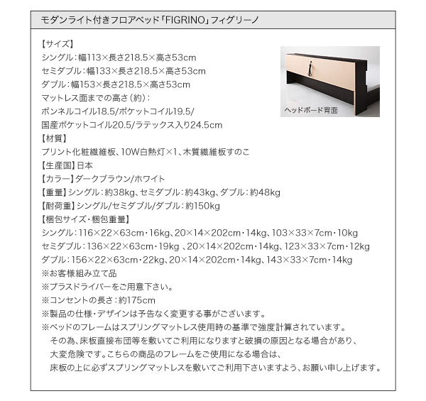 ※ベッドのフレームはスプリングマットレス使用時の基準で強度計算されています。 その為、床板直接布団等を敷いてご利用になりますと破損の原因となる場合があり、大変危険です。 こちらの商品のフレームをご使用になる場合は、床板の上に必ずスプリングマットレスを敷いてご利用 下さいますよう、お願い申し上げます。